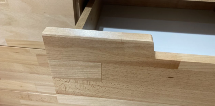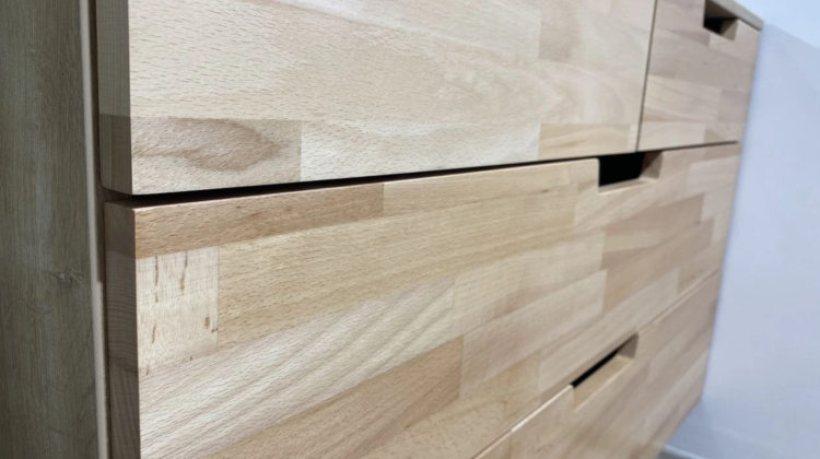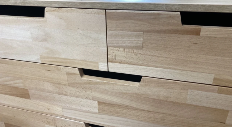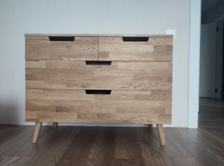 - Фасады ящиков и ножки изготовлены из массива бука, дуба или березы. Корпус комода и ящиков — из ЛДСП. Задняя стенка — ХДФ 3 мм.