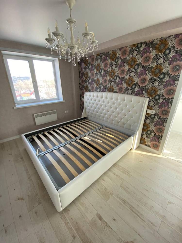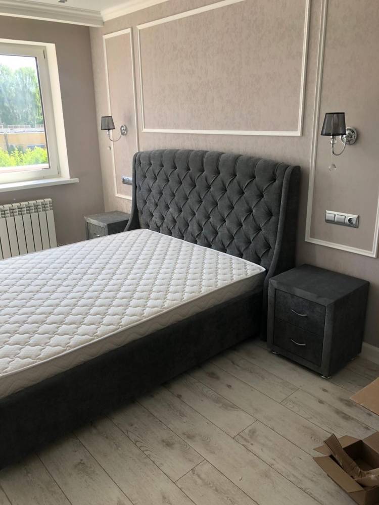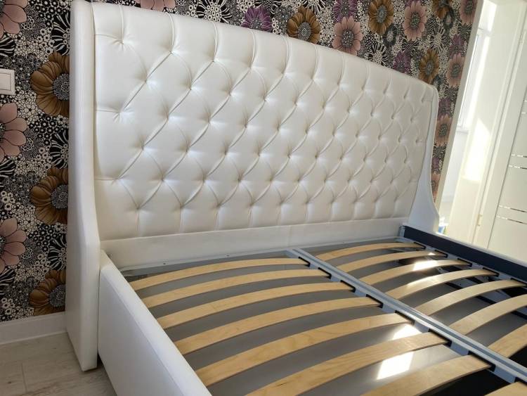 - Изящная форма изголовья, оформленного каретной стяжкой