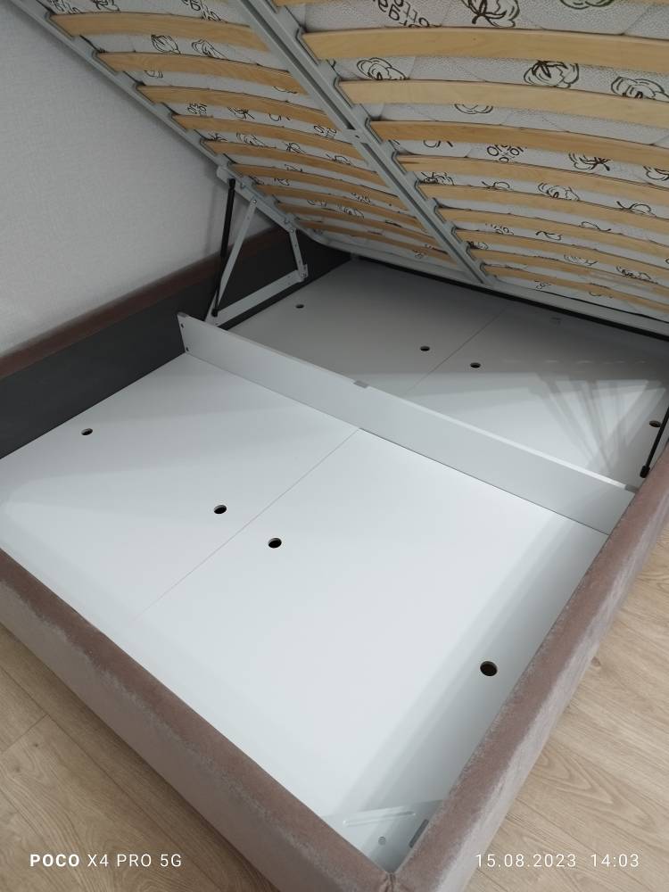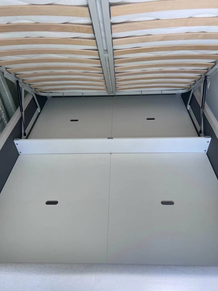 - Дополнительно можно заказать подъемный механизм и бельевой ящик (глубина ящика составляет 14 см), чтобы использовать место под кроватью для хранения. Дно бельевого ящика легко сдвигается для обеспечения уборки под кроватью.